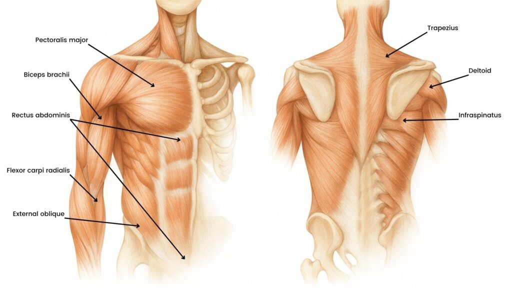 - Bursa: Fluid-filled sacs that reduce friction between bones, muscles, and tendons. They can become inflamed from overuse.